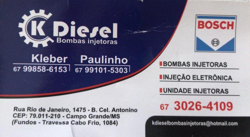 K DIESEL BOMBAS INJETORES BOMBAS INJETORAS INJEÇÃO ELETRÔNICA UNIDADE INJETORAS RUA RIO DE JANEIRO, 1475 - B. CEL. ANTONINO - CAMPO GRANDE - MS - CEP 79.011-210 (FUNDOS - TRAVESSA CABO FRIO, 1084) TELEFONE (67) 99858-6153 (KLEBER) TELEFONE (67) 99101-5303 (PAULINHO) TELEFONE (67) 3026-4109