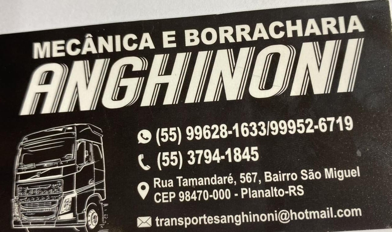 MECÂNICA E BORRACHARIA ANGHINONI RUA TAMANDARÉ, 567 - BAIRRO SÃOP MIGUEL - PLANALTO - RS - CEP 98470-000 EMAIL TRANSPORTESANGHINONI@HOTMAIL.COM TELEFONE (55) 99628- 1633 - (55) 99952-6719 - (55) 3794-1845
