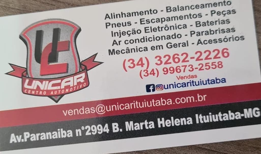 UNICAR CENTRO AUTOMOTIVO SERVIÇOS DE ALINHAMENTO E BALACEAMENTO DE VEÍCULOS AUTOMOTORES AV PARANAIBA, 2994 - MARTA HELENA - ITUIUTABA - MG - CEP 38.307-160 TELEFONE (34) 3262-2226 -(34)3262-2562 - (34) 99673-2558