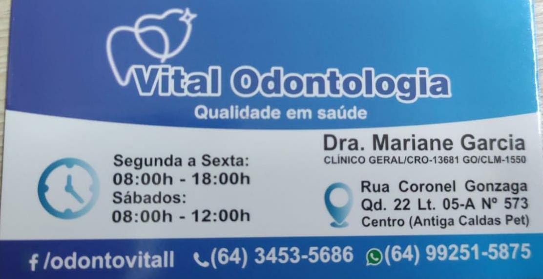 VITAL ODONTOLOGIA QUALIDADE EM SAÚDE RUA CORONEL GONZAGA QD. 22 LT 05 - A N 573 CENTRO (ANTIGA CALDAS PET) - GO - CEP 75.680-053 TELEFONE (64) 3453-5686 (64) 99251-5875