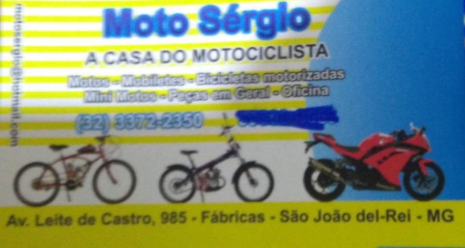 MOTO SERGIO COMERCIO A VAREJO DE PEÇAS E ACESSORIOS NOVOS PARA MOTOCICLETAS E MOTONETES AV LEITE DE CASTRO,985 - FABRICAS -SÃO JOÃO DEL REI - MG - CEP 36.301-182 TELEFONE (32) 3372-2350