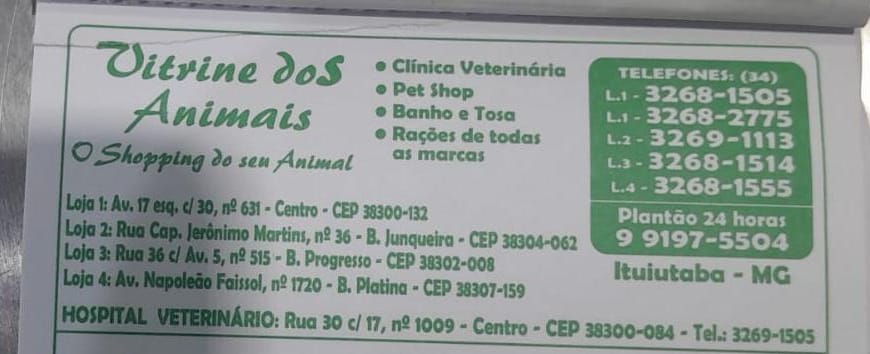 PET SHOP VITRINE DOS ANIMAIS LOJA 1 : ESQ. C/30, 631 - CENTRO - CEP 38300-132 LOJA 2 : RUA CAP. JERÔNIMO MARTINS, 36 - B. JUNQUEIRA - CEP 38304-062 LOJA 3 : RUA 36 C/AV 5, 515 -B PROGRESSO - CEP 38302-008 LOJA 4 ; AV NAPOLEÃO FAISSAL, 1720 -B PLATINA - CEP 38307-159 ITUIUTABA - MG TELEFONES: (34) 3268-1505 - 3268-2775 - 3269-1113 - 3268-1514 - 3268-1555 -99695-6161