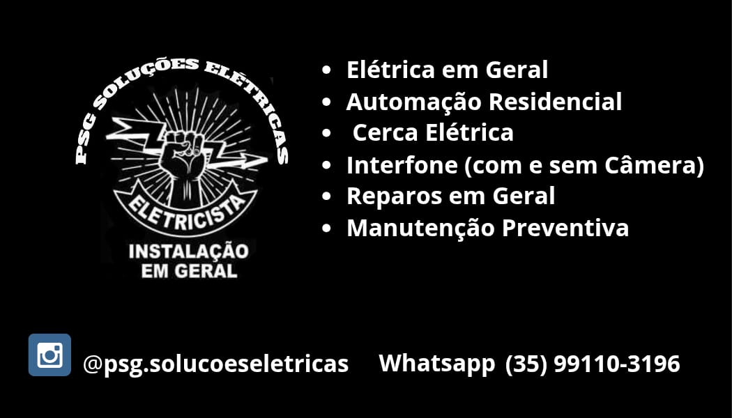 PSG SOLUÇÕES ELETRICAS INSTALAÇÃO E MANUTENÇÃO ELÉTRICA RUA PREFEITO JOSÉ RIBEIRO PEREIRA FILHO, 405 - CENTRO - ITAMONTE - CEP 37466-000 PALMERSILVAGASPAR@YAHOO.COM.BR TELEFONE (35) 99110-3196Sobre