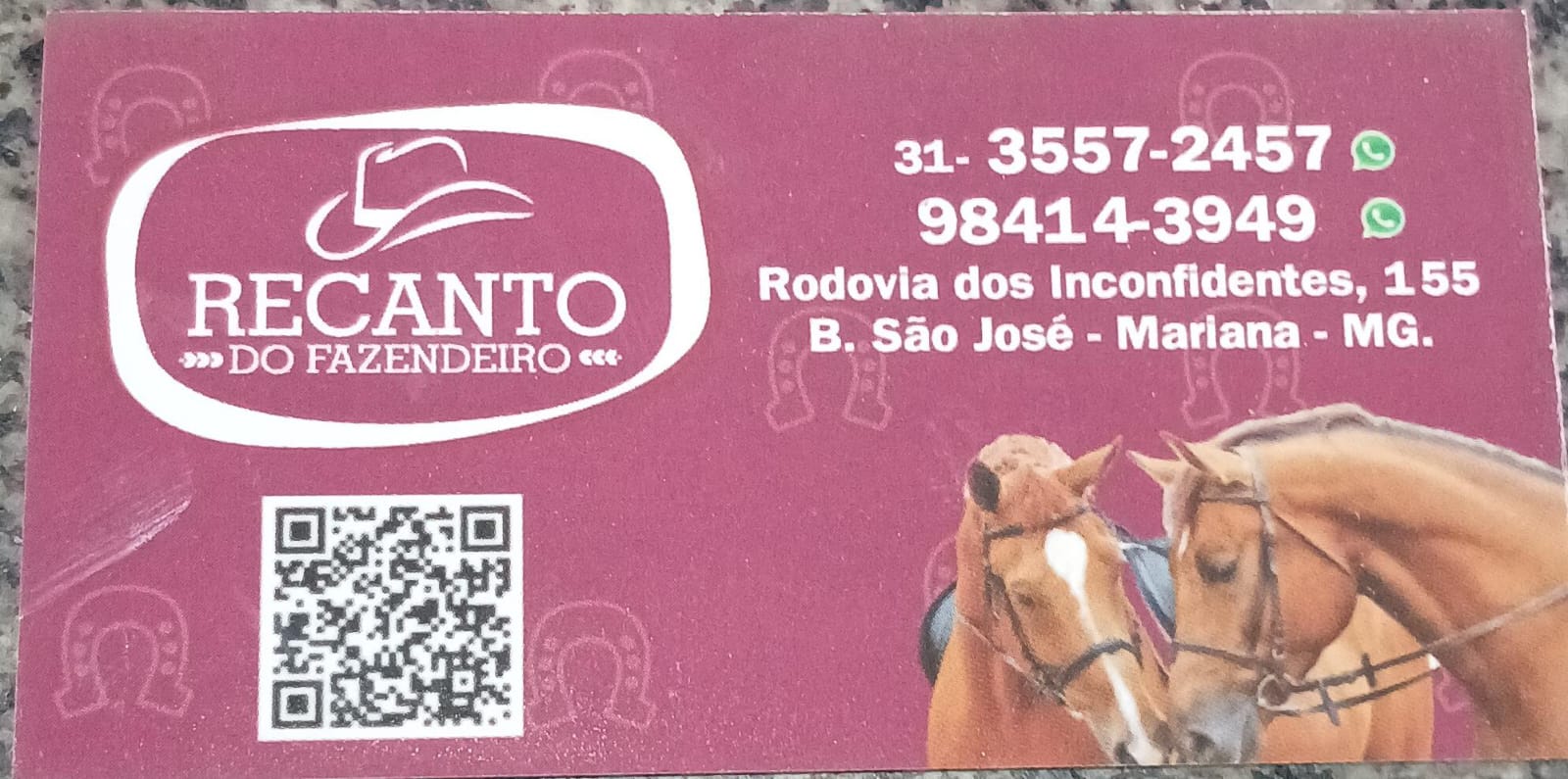 RECANDO DO FAZENDEIRO COMERCIO VAREJISTA DE ANIMAIS VIVOS E DE ARTIGOS E ALIMENTOS PARA ANIMAIS DE ESTIMAÇÃO RODOVIA DOS INCONFIDENTES, 155 - B. SÃO JOSÉ - MARIANA - MG -CEP 35.420-000 (31) 3557-2457 - (31) 98414-3949