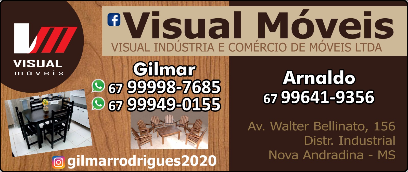 VISUAL INDUSTRIA E COMERCIO DE MOVEIS FABRICAÇÃO DE MOVEIS COM PREDOMINÂNCIA DE MADEIRA AV WALTER BELLINATO, 156 - DISTRITO INDUSTRIAL JOSÉ MARQUES - NOVA ANDRADINA - MS - CEP 79.750-000 TELEFONE (67) 99998-7685 - (67) 99641-9356